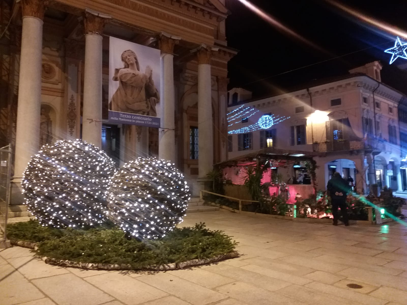 BORGOMANERO – 10-12-2021 – Il Natale si avvicina e Borgomanero è pronta ad accoglierlo. Nella centrale piazza Martiri sono stati completati gli allestimenti natalizi divisi sui quattro canti che si affacciano alla collegiata di San Bartolomeo. Sul suo sagrato, dove ci sono ancora i lavori di restauro della chiesa, sono state poste due grandi palle di legno illuminate e a fianco il tradizionale presepe dove, dopo la messa di mezzanotte, verrà deposto il Bambin Gesù. Di fronte è attiva la pista di pattinaggio, diventata ormai un appuntamento fisso per molti borgomaneresi che rimarrà fino a gennaio. Negli altri due angoli, affacciati ai caffè, un grande albero di Natale e la giostra per bambini.
