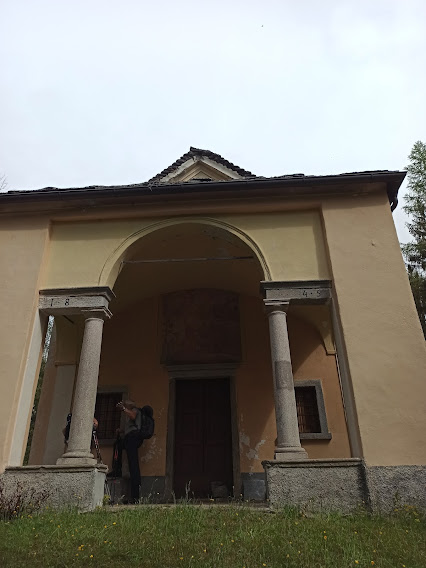 Al primo tornante attraversiamo un prato per portarci sulla bella mulattiera che sale dal centro e così, saggezza a parte, siamo subito a bagno. Gli scarponi “da neve” non pensavamo servissero sui sentieri di Crevoladossola, ma avevamo fatto i conti senza la guida. Arriviamo a Ternaro, passiamo Borgo dell’Era e ci fermiamo brevemente all’Oratorio dei Santissimi Carlo, Rocco e Sebastiano a Pinone. Adesso non piove.