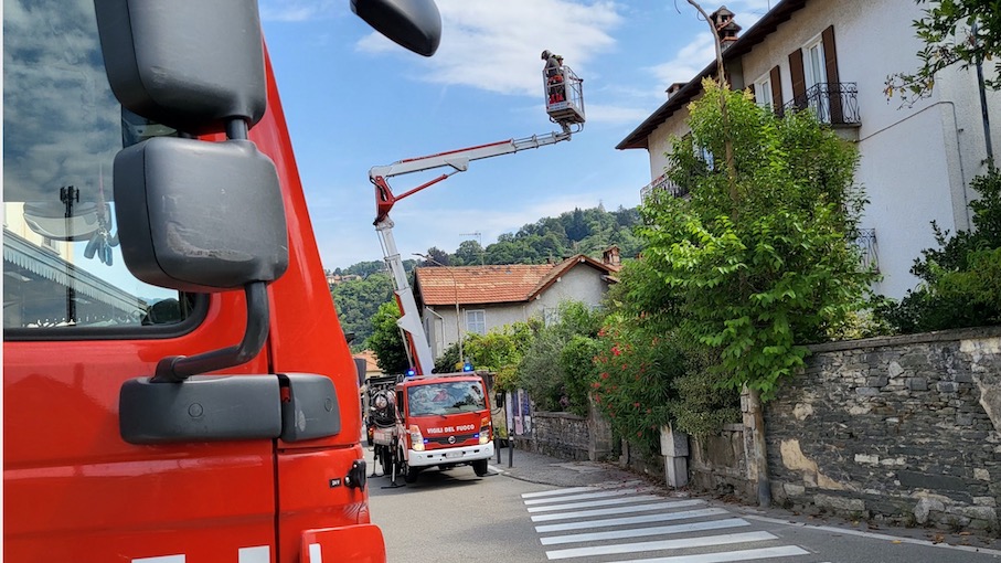 ORTA SAN GIULIO - 15-07-2022 -- Con l’intervento di due squadre di Vigili del Fuoco di Borgomanero e Romagnano Sesia sono state rimosse a Legro -piccola frazione di Orta San Giulio famosa per i suoi muri dipinti- le porzioni pericolanti dell’alta installazione firmata da Barbara Biscuola e realizzata con un collage di arte povera utilizzando legno, pietra, ferro e beola sulla canna fumaria di un locale in piazza della stazione.