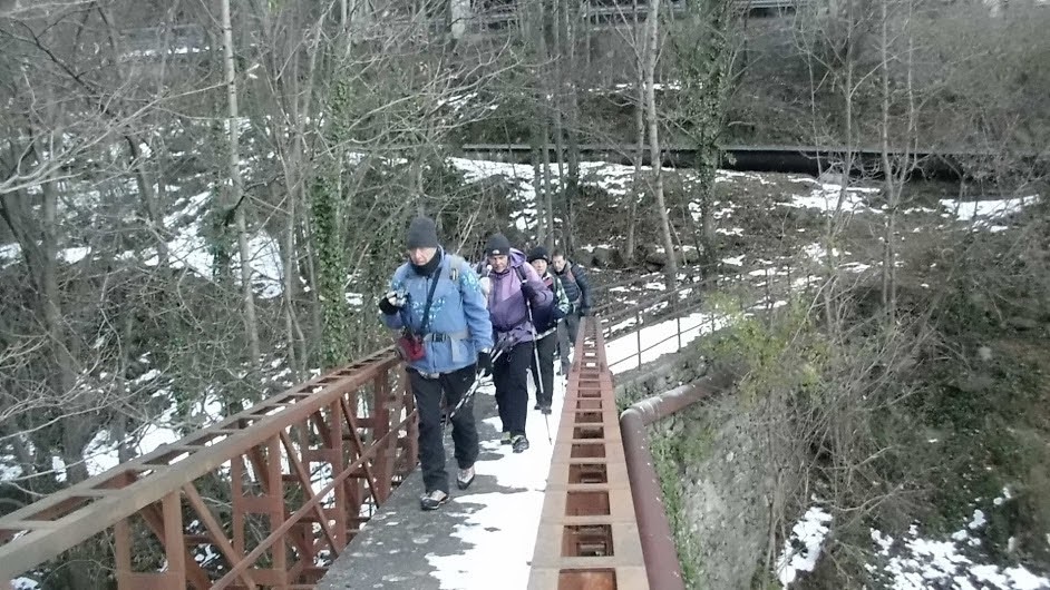Dopo dieci minuti vediamo le luci accese a casa di un caro amico, ma tiriamo diritti, riflettendo sul fatto che lui sta andando al lavoro, attività da tempo ignota alla maggior parte di noi. Ed allora si prosegue, evitando la deviazione per il sito megalitico di Varchignoli, per problemi di ghiaccio e orario. Un po’ di asfalto fra Boschetto e Cresti, poi si riprende la bella mulattiera. Prima di Seppiana c’è un po’ di lavoro per le guide. Il peso della neve, poi gelata, ha bloccato dei grossi arbusti che ostruiscono il percorso.