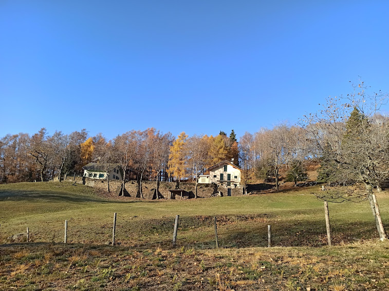 Subito incontriamo un cartello indicatore molto preciso che, a poche decine di metri da Cappella Fina, ancora ben in vista, indica “1 minuto” per raggiungerla. Si vede che qui c’è spesso nebbia fittissima. Lungo il sentiero (ma ci sarebbe anche la strada asfaltata) arriviamo quasi al Memoriale degli Alpini, sopra l’Alpe Pala. Troviamo un tagliafuoco, sulla destra, che diventerà poi sentiero. Lo seguiamo verso occidente risalendo dolcemente circa un centinaio di metri fino a chiudere l’anello poco sopra l’Alpe Aurelio.