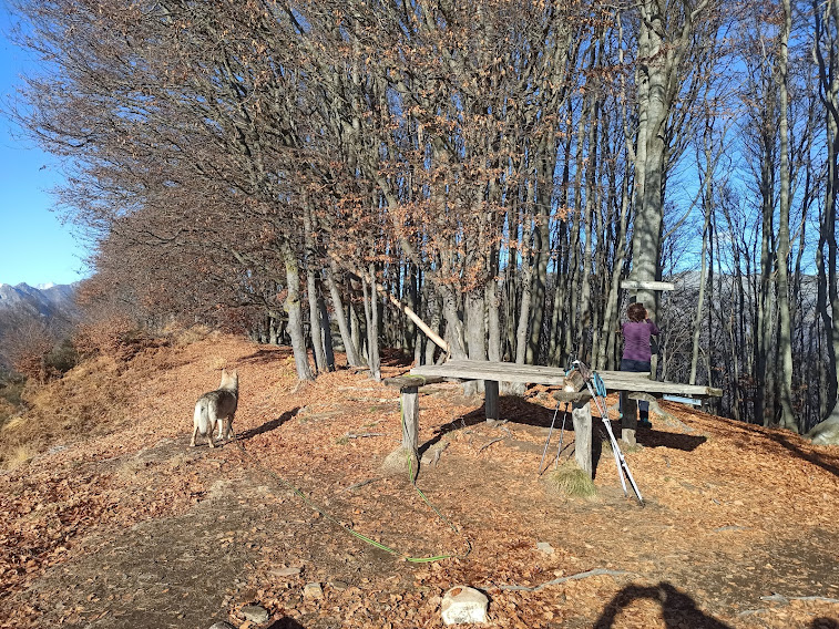 Anche oggi è una splendida giornata e ci godiamo il bellissimo panorama. Rispetto alle precedenti salite non troviamo il consueto spessissimo strato di foglie di faggio poco sotto la cima. Si vede che anche il vento sta cambiando, nel vero senso della parola. Percorriamo verso nord – est la splendida dorsale che separa la Val Pogallo dal versante rivolto verso il Lago.