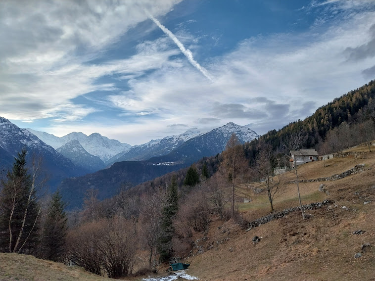 Lei mi ha anche detto, con reciproca tristezza, che gli sci sono un bel ricordo del passato, ma non servono neppure le ciaspole. E stiamo parlando di salire a quota 1750 a fine dicembre, ahimè! Ci troviamo per il solito caffè a Varzo ed ottimizziamo le auto per salire rapidamente a Coggia lungo la stretta stradina asfaltata. Siamo in sei con badante titolare e giovane aiuto-badante francese, medico di turno e tre anziani, uno dei quali in perenne sofferenza.