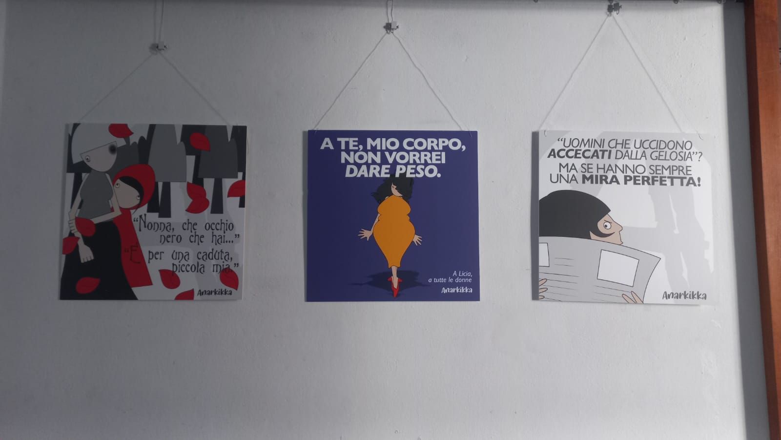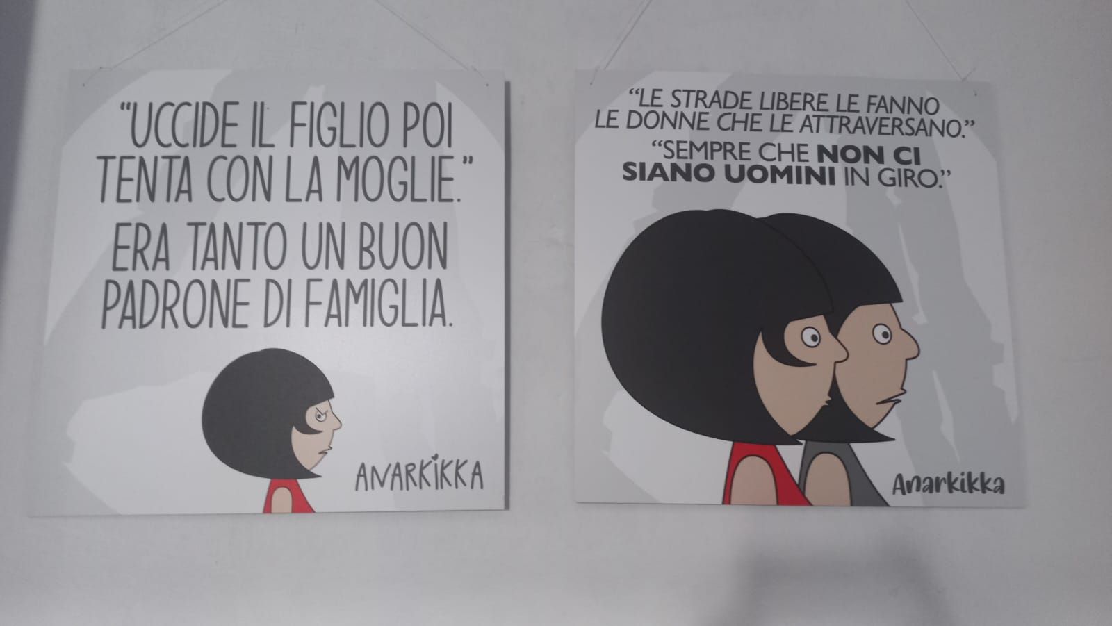 La mostra approfondisce il tema della violenza e del linguaggio che usiamo nel raccontarla. Linguaggio che si fa complice perché veicola e rafforza una narrazione sbagliata della sopraffazione, che abbiamo tutti interiorizzato. Per cui gelosia è attenzione, possesso è amore, delitto è raptus, inteso come risposta “passionale” alla disperazione, al tormento. Un linguaggio assolutorio, che nell’assolvere il criminale minimizza il crimine, nel relegare alla follia individuale deresponsabilizza una comunità che non fa i conti con la propria identità e valori, con il proprio sistema di significati. Assolve l’uomo e getta ombre sulla donna, sulla vittima, che diventa l’istigatrice del gesto folle, la responsabile, quella che “se l’è (sempre) cercata”. Quella, che ancora una volta, ha “la colpa” del suo stesso esistere. Una raccolta di vignette pubblicate negli anni che tenta di offrire un percorso che aiuti a ri-conoscere le disparità e le differenze.