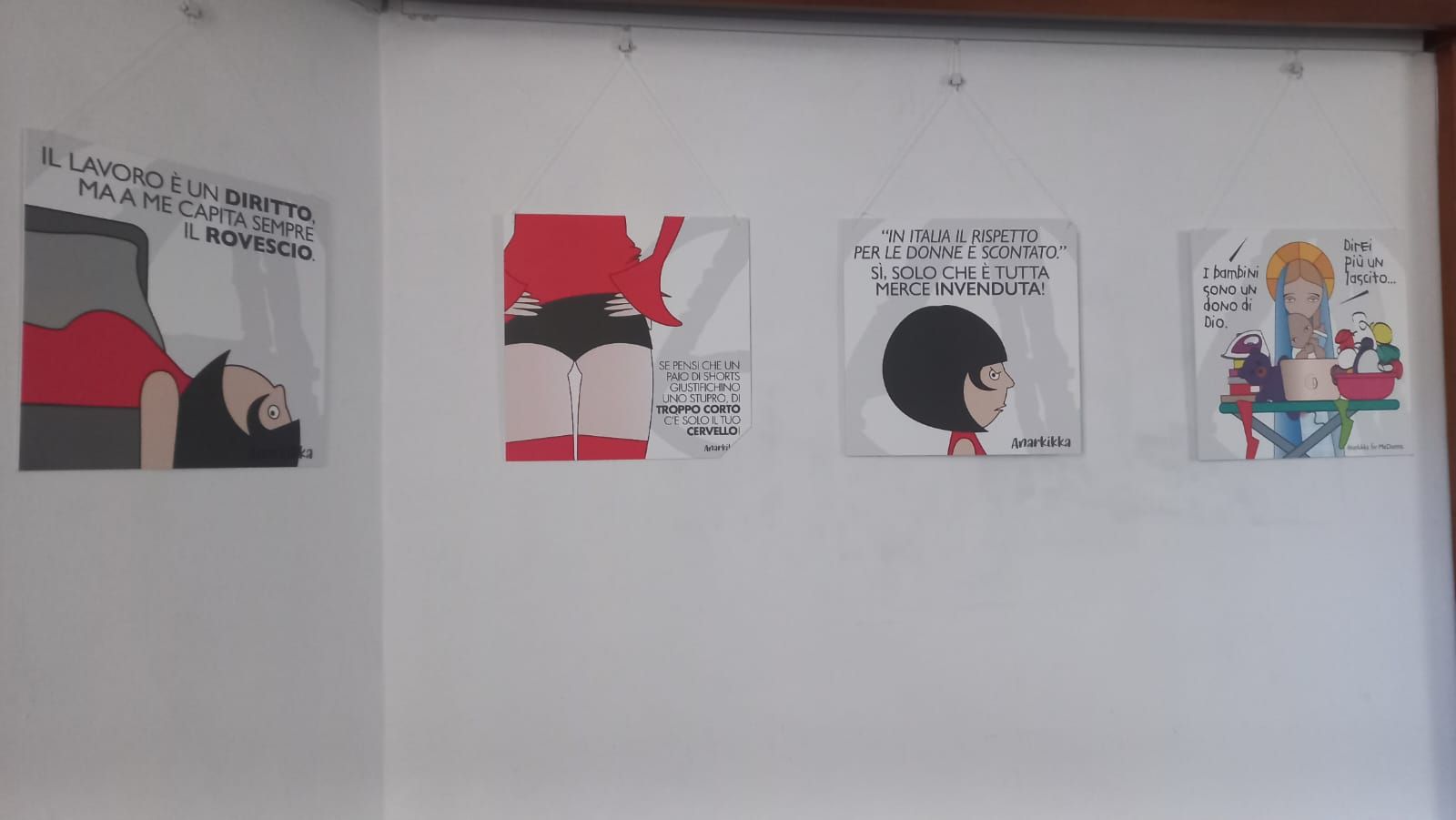 L'esposizione dei pannelli della mostra "Smettetela di farci la festa" racconta di donne per parlare di società e della cultura in cui si cresce, ingabbiati in ruoli stereotipati funzionali a quel sistema di potere alla base delle relazioni umane che alimenta discriminazioni, disparità e violenza. Maschilismo, sessismo, molestie, sono riflesso di uno stesso squilibrio che pone gli uomini in posizioni di privilegio e le donne in condizione di perenne affanno nella lotta per la parità. Uno squilibrio che è manifesto nell’educazione che riceviamo, nelle discriminazioni riguardo agli studi e sul lavoro, nella differenza di retribuzione, nel linguaggio, nelle violenze di genere, nei femminicidi.