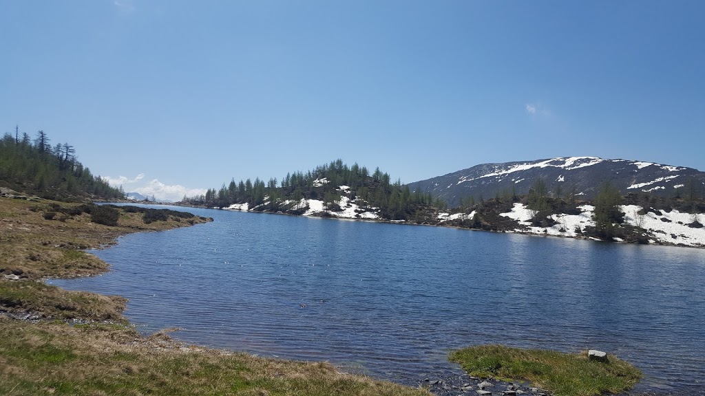 Attraversiamo i prati ed entriamo nel bosco su un sentiero evidente in dolce salita. Alla nostra sinistra il pendio precipita verso la valle dell’ex torrente Deseno, quasi sempre asciutto quando lo si attraversa sul ponte fra Mocogna e Caddo, cioè fra Domodossola e Crevoladossola. Anche lì pare che l’acqua sia fagocitata, per strada, da una centralina idroelettrica. Arriviamo alla bellissima Alpe Dentro, 1702, e ci permettiamo anche qui una breve sosta. Alla nostra destra, leggermente più in alto, corre la pista agro-silvo-pastorale che sale all’Alpe d’Andromia, 1887. Noi restiamo sul sentiero e, lasciando alla nostra sinistra l’alpe, raggiungiamo dopo un’ora e un quarto il lago, 1937. E’ uno dei più belli del nostro territorio, dominato dal Pizzo Albiona.