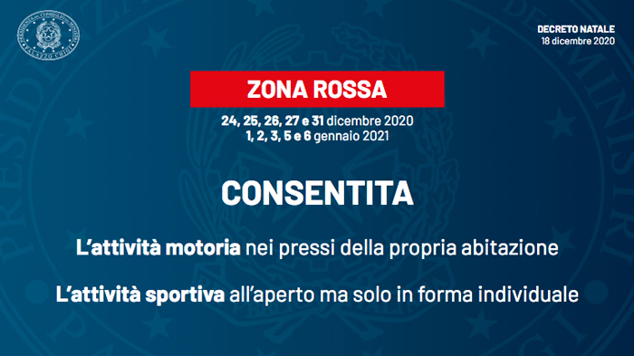 In particolare il 24, 25, 26, 27 e 31 dicembre 1, 2, 3, 5, 6 gennaio saranno giornate rosse per tutto il Paese, dove si potrà uscire di casa solo per ragioni di lavoro, necessità e salute.