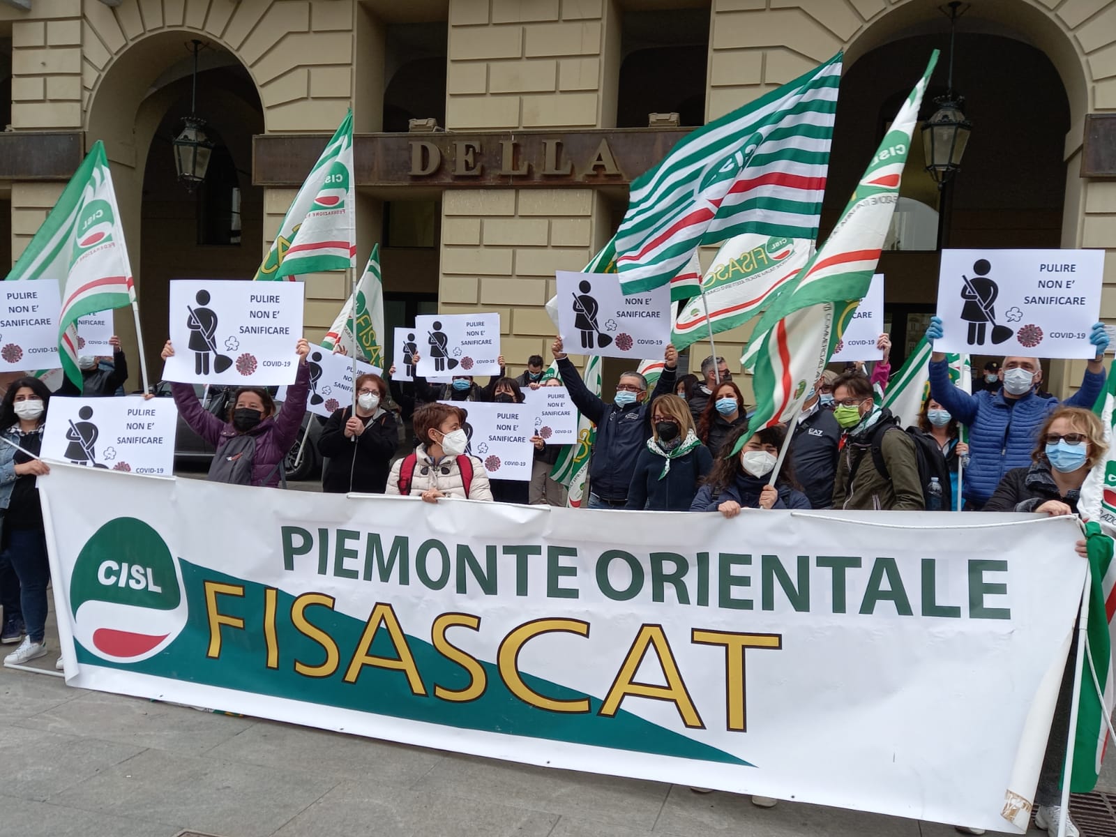 TORINO - 26-04-2021 - Alcune decine i lavoratori del settore di pulizia e sanificazione del Piemonte Orientale (Novara, Vercelli, Biella e Verbania) oggi hanno manifestato in piazza Castello a Torino, sotto la sede della Regione, contro gli eccessivi ribassi dell'appalto, aggiudicato alla società Markas Srl con un meno 30,12 % sulla base d'asta per il servizio nelle aziende sanitarie del territorio. Il timore è che un tale ribasso penalizzerà lavoratori e qualità del servizio. La Fisascat Cisl Piemonte Orientale ha proclamato per oggi lo sciopero del comparto per l’intera giornata. Sono circa 600 i lavoratori interessati. "Vogliamo massima trasparenza sul lotto 5 – spiegano i segretari generale Fisascat Cisl e Cisl Piemonte Orientale, Luca Trinchitella ed Elena Ugazio – che riguarda la pulizia e la sanificazione nelle aziende ospedaliere delle provincie di Biella – Novara – Verbania – Vercelli. Considerato che il costo del lavoro in appalti di questa natura rappresenta circa l’85% del totale dell’appalto, appare chiaro che un ribasso di tale portata non potrà che avere riflessi molto negativi sia nei confronti dei lavoratori, in termini di ore lavorate e sicurezza, sia nella qualità dei servizi delle strutture interessate”.