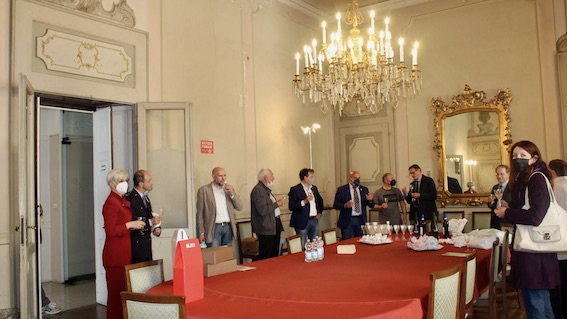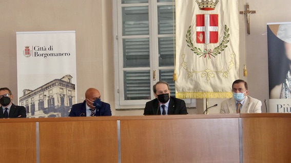 BORGOMANERO - 16-05-2021 -- Nella mattinata di venerdì 14 maggio Borgomanero è diventata ufficialmente Città del Vino. L’ufficializzazione è avvenuta nella Sala Consigliare di palazzo Tornielli. Presenti il Presidente dell’Associazione Nazionale Città del Vino Floriano Zambon, il vice Stefano Vercelloni e l’ambasciatore Valentino Guglielmini, il Sindaco Sergio Bossi e la Giunta, oltre ad alcuni produttori locali di vino e il presidente dell’Associazione Pasticceri.