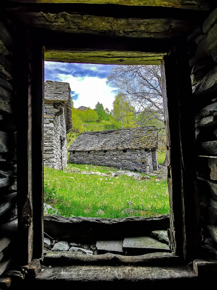In nove ci ritroviamo nella piazzetta di Altoggio, 742, la frazione più alta e soleggiata del comune di Montecrestese. La giornata per ora è bella e, su consiglio di esperti meteorologi, lascio l’ombrello in auto. Una paziente signora sopporterà per tutto il giorno otto pensionati più o meno anziani, fra i quali un ex alpinista ignoto. In orario “umano” attraversiamo la frazione e, dopo l’Oratorio di San Giovanni, teniamo la destra lungo i prati fino alla Cappella di Cimavalle, 754.