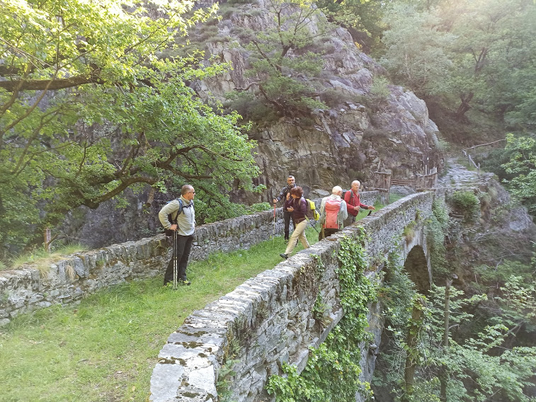 Di qui il sentiero ben segnato scende ad attraversare sul Ponte del Diavolo, 600, la profonda forra del torrente Isorno, uno dei tanti paradisi del canyoning presenti nelle valli ossolane. Oltre il ponte si comincia a salire subito in presa diretta. Del resto il dislivello perso lo si deve pur recuperare in qualche modo. Il sentiero è sempre evidente e, a quota 820, raggiungiamo le prime baite di Aulogna. In questo bosco ci sono degli spettacolari castagni ultracentenari, uno dei quali forma alla base un'ampia galleria che può fare da cornice naturale ed abbellimento ad anziani che si vogliono far fotografare. Ci teniamo a destra e, sempre in presa diretta, saliamo a quota 924, dove la condotta forzata quasi orizzontale proveniente da Cippata si tuffa verso il fondovalle.